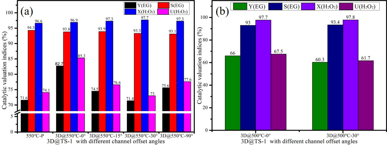 图2.具有不同通道偏移角(0°、15°、30°和90°)的3D打印整体TS-1的催化反应结果