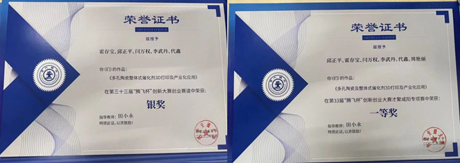 研究团队近年来,以“创新多孔陶瓷、整体式催化剂制造,助力实现碳中和、碳达峰”为发展理念,致力于高性能功能陶瓷、整体式催化剂、微反应器3D打印产品开发与技术研发,与材料、化工领域交叉融合,实现了3D打印催化剂在石油化工、碳吸附碳中和等领域的应用。目前3D打印催化剂产品已在中石油兰化研究院完成中试验证。团队开展产业化应用推广,进行产学研融合,研发的结合仿真计算、反应器结构优化设计并3D打印整体式多孔陶瓷、催化剂与微反应器的定制化制造技术获得了陕西省秦创原春种基金投资。课题组支持学生创新创业,3D打印多孔陶瓷、整体式催化剂项目在多次创新创业大赛中获奖。